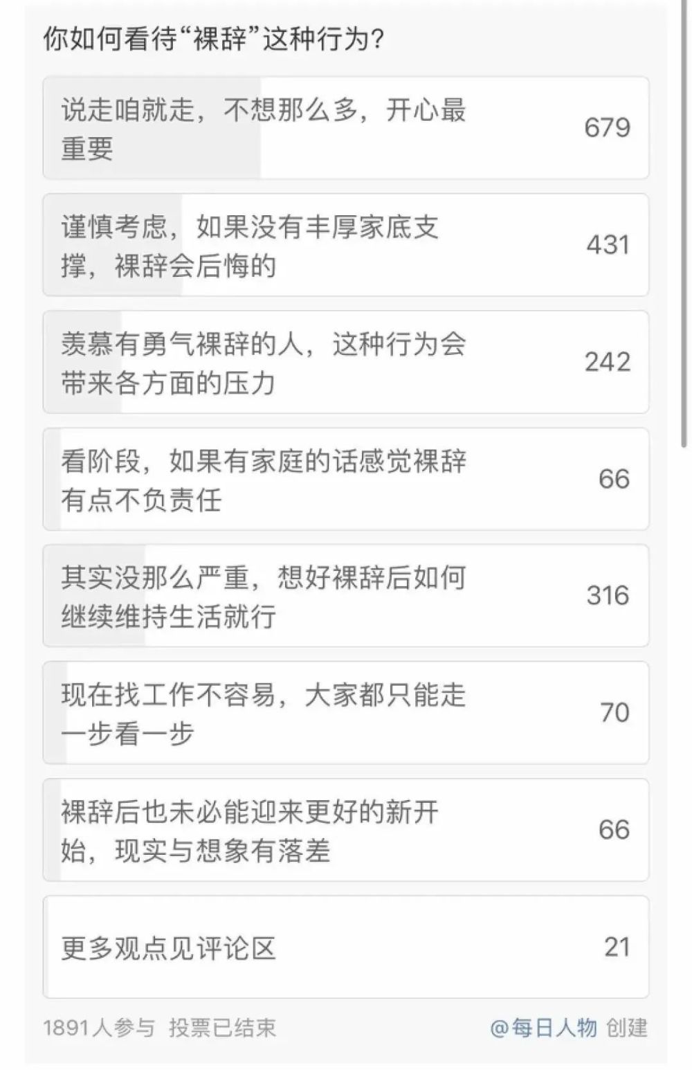 在@每日人物 发起的一场关于“裸辞”的投票中,可以看出这代年轻人更加向往自由,注重个人感受。