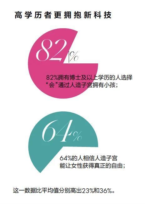 在所有受访者中,81%的人群支持人造子宫;59%选择“会”通过人造子宫拥有小孩,在已婚未育(非丁克)的人群中,这一选择的支持率超过89%。