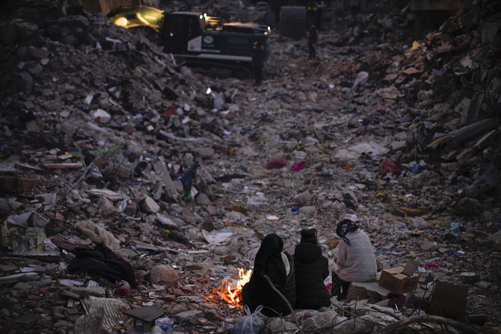 当地时间2023年2月15日,土耳其南部安塔基亚,地震之后,人们在废墟边的火堆旁取暖。视觉中国 图