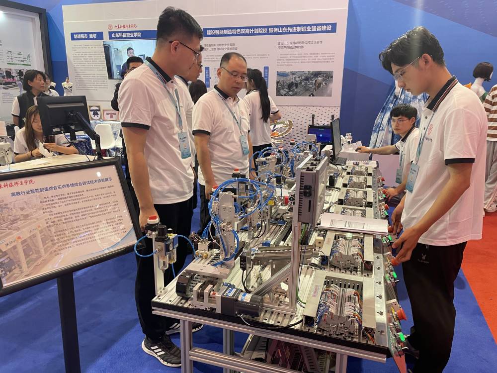 山东科技职业学院深耕制造业领域,对接制造强国战略,建设智能制造特色鲜明的双高计划院校。现场,该校学生基于离散行业智能制造综合实训系统,展示自动化生产线现场工程师岗位的核心技术技能。该系统模拟真实工业生产中的智能制造自动化生产线,构建了一个能让学生参与训练、设计、构建和调试,让老师进行开发、设计、创新、优化的真实工作环境。