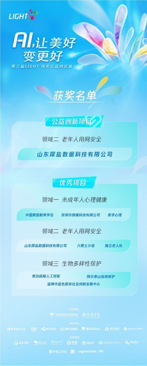 第三届Light共吸引1429支队伍报名参与公益提案,最终有24支队伍入围。路演现场,三大领域的入围队伍以更专业、更热情的态度,展示技术公益的个性化、多元化解决方案。经过专业评委现场评审,创造营最终优胜名单出炉:“未成年人心理健康”议题的中国家庭教育学会、深圳市镜像科技有限公司、麦芽心理,“老年人用网安全”议题的山东犀盐数据科技有限公司、六便士小组、独立老人队,“生物多样性保护”议题的爱动超越人工智能、阿尔泰山自然保护、淄博市蓝色蔚来社会创新发展中心等众多队伍入选优秀项目;其中,山东犀盐数据科技有限公司凭借在“老年人用网安全”议题中的创新探索,入选公益创新项目。