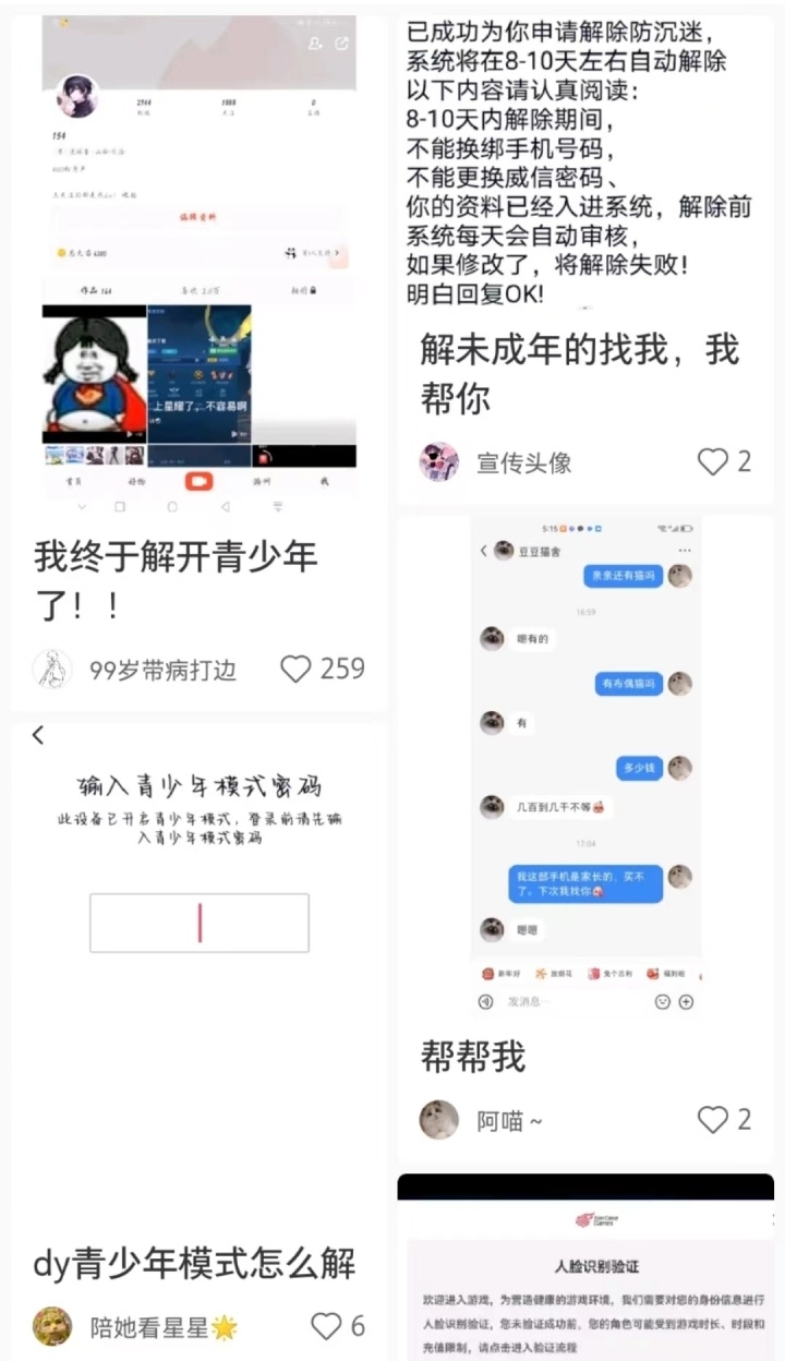 “有人帮帮忙吗,解开青少年模式?可付费。”“想在抖音买东西,谁告诉我怎么解锁?”一些人明目张胆地发帖提问。而另一些帖子则在分享“解绑攻略”。甚至有人宣称,“解锁未成年找我”,“抖音解锁教程”
