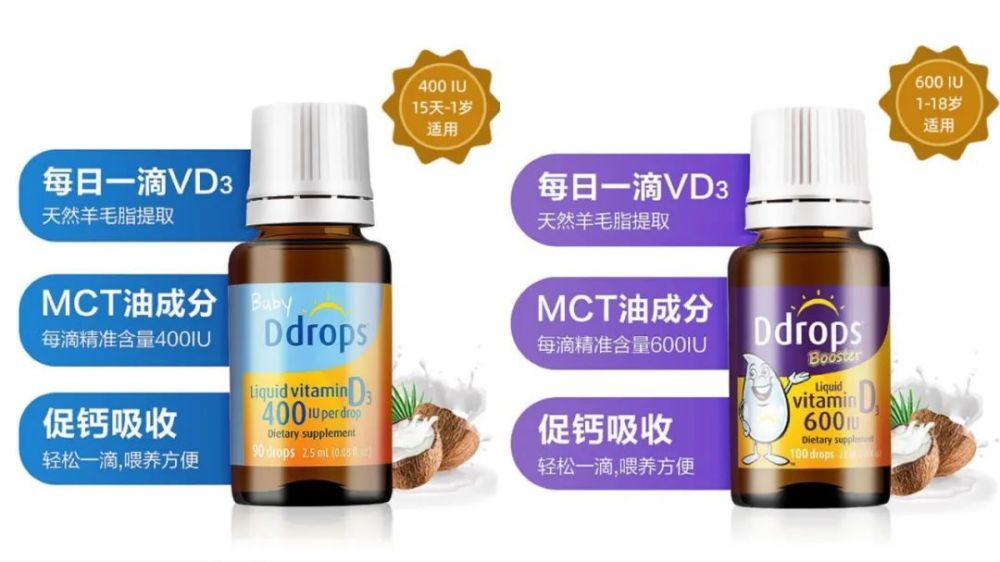 这个滴剂有两个规格,1岁以内选蓝色包装的(2.5mL/瓶,90滴,每滴含 400IU 维生素D3),1岁以上选紫色包装的(2.8mL/瓶,100滴,每滴含 600IU 维生素D3)。