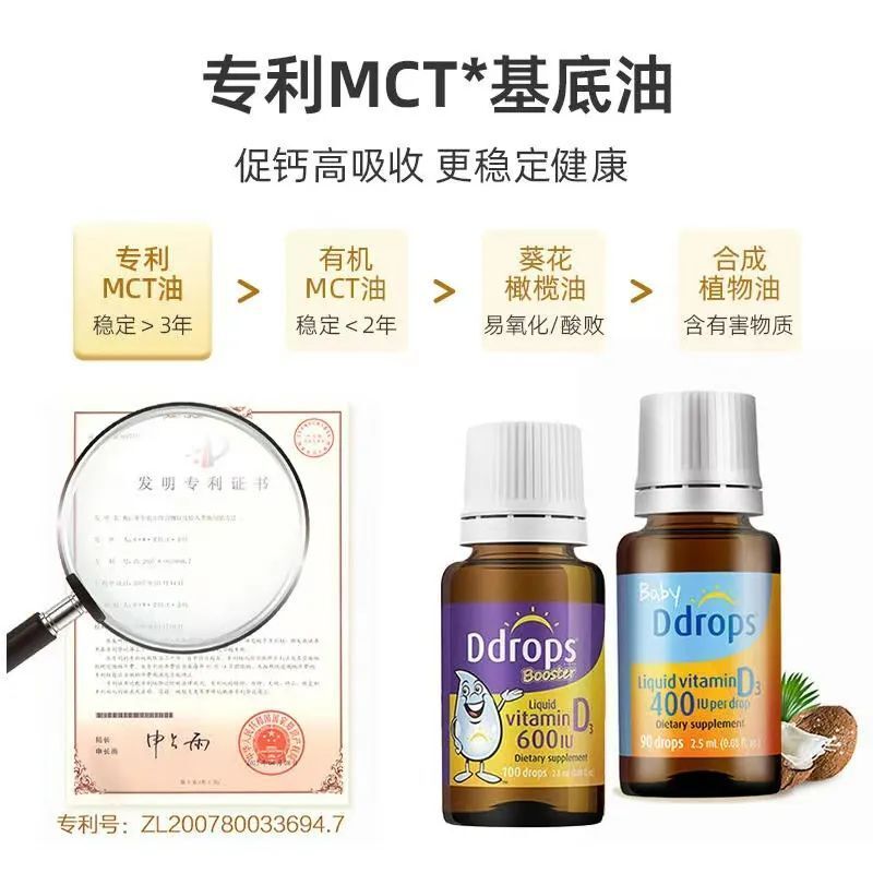 而且它的滴头可是有专利的哦,比一般无专利的普通滴头更精准,每滴维生素D3含量可以稳定在 400IU(?600IU 款的稳定在 600IU)。