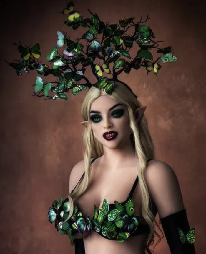 头顶树枝吸引众多蝴蝶的吸血鬼Natalie,有着血红色的嘴唇,散发着迷人又危险的气息。