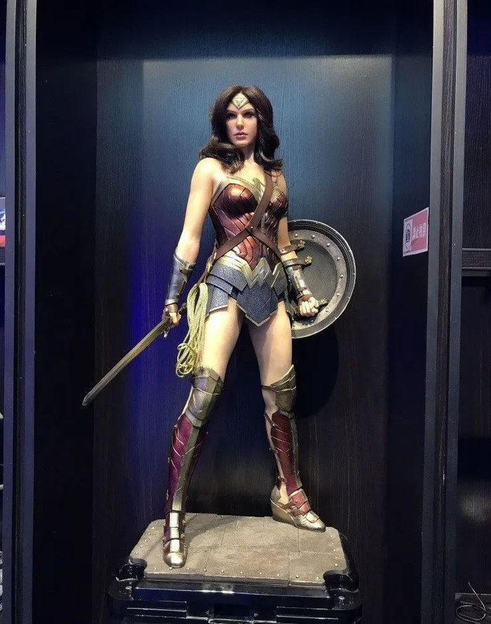 手持火神之剑与神力护盾的神奇女侠,目光坚毅,双腿修长。