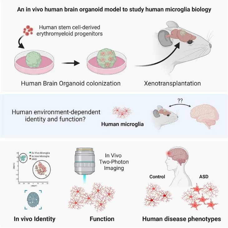 小胶质细胞(microglia)是专门驻留在脑部的免疫细胞,在脑发育和神经系统疾病(如自闭症谱系障碍、阿尔茨海默病等)中起重要作用。但要在体外环境研究小胶质细胞非常困难,因为一旦脱离脑组织环境,它们几乎失去所有的功能。