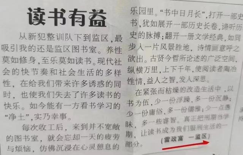 近日,网上传出雷政富在狱中发表的一篇文章,题目叫《读书有益》,虽然字数不多,但文笔颇佳,原来狱中服刑的雷政富,已将读书当作了最大的乐趣。