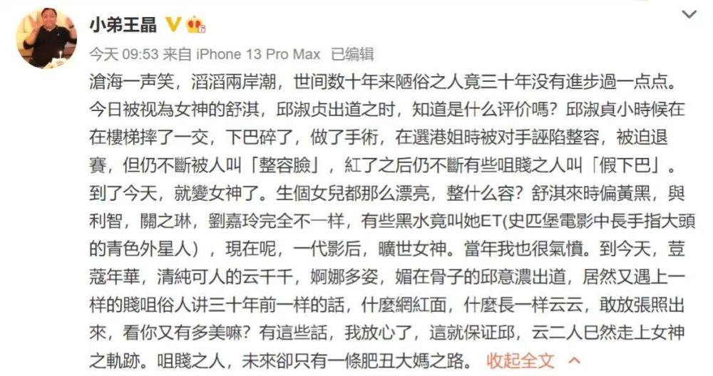 这时候,王晶发布了一条长文,引用了舒淇和邱淑贞等人的经历为例子,表示邱意浓已经走上了女神之路。