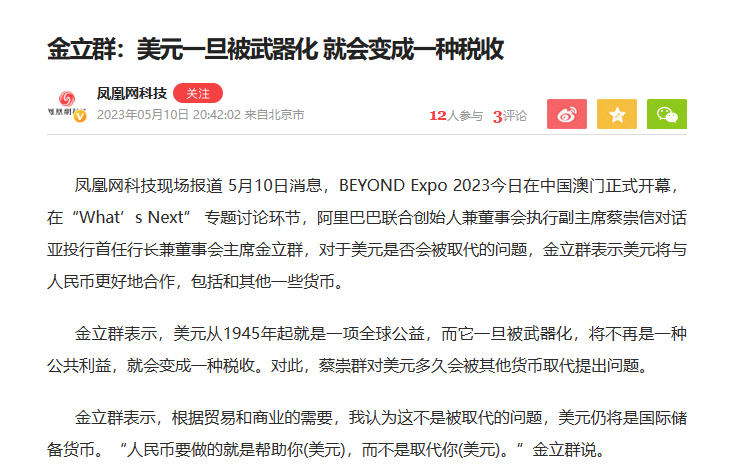 据凤凰网现场新闻报道5月10日消息,亚投行行长金立群在出席BEYOND 国际科技创新博览会时,对全球去美元化以及人民币国际化等一系列国际货币的重要问题,做了一定程度上的释义。