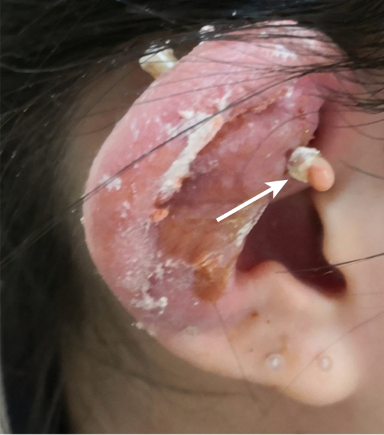 一名15岁女孩在右耳廓打耳洞后出现持续性耳痛。穿刺5天后,她不仅存在穿刺邻近区域耳痛,且右侧颈部也出现疼痛。这例患者在就诊前曾接受了1个疗程的抗生素静脉注射,并接受了切口引流,但症状持续存在。