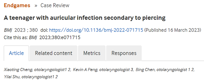 [1] Cheng XT, Peng KA, Chen B, et al. A teenager with auricular infection secondary to piercing. BMJ. doi: 10.1136/bmj-2022-071715
