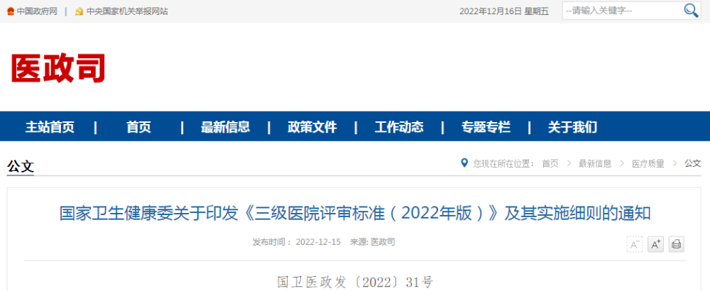 国家卫生健康委关于印发《三级医院评审标准(2022年版)》及其实施细则的通知