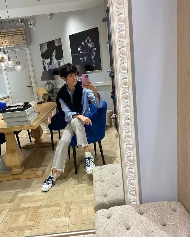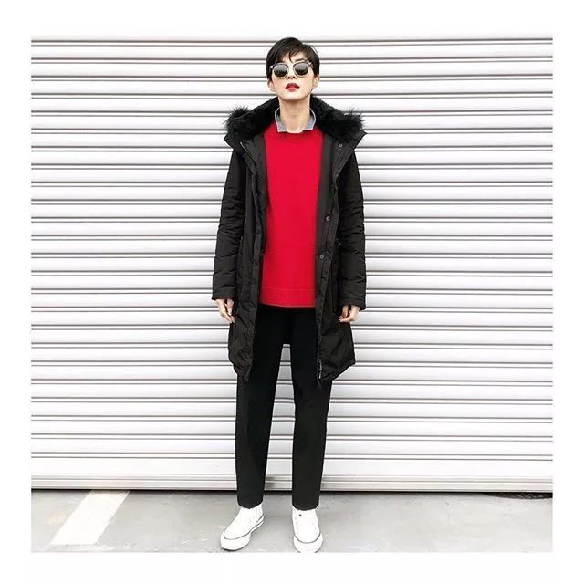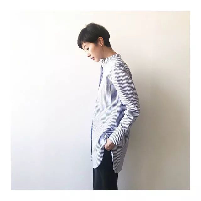 在根本久仁子的个人社交空间,她很少穿到的红色也出现在了自己的日常搭配中,很有气氛是不是,不过右侧的长款条纹衬衫帅气的样子才是她的日常。