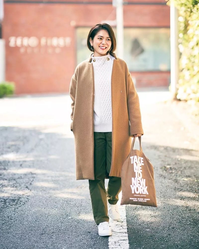 如果大家关注这个栏目你会发现不论是博主还是素人,真的一件驼色的大衣不论什么人都是值得购入的,比如大日方这一件长款大衣内搭全身白色系,干净且高级。
