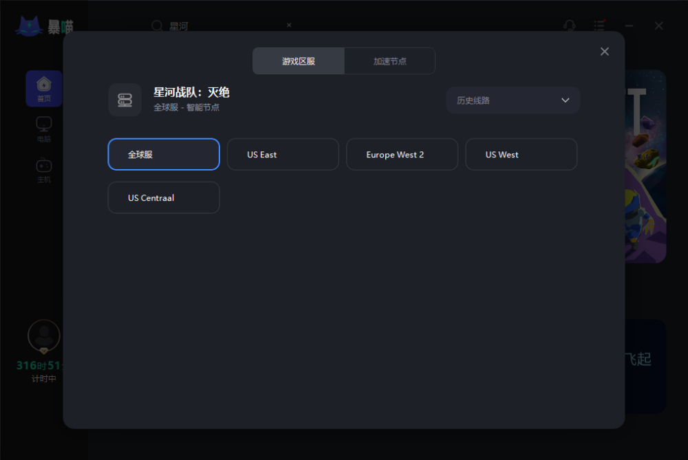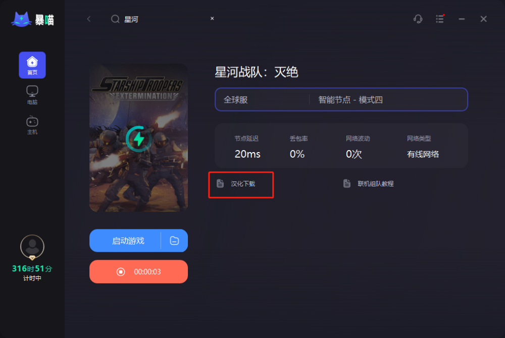 汉化包需要通过暴喵加速器来下载,我们先下载一个暴喵加速器,搜索【星河战队灭绝】并加速,推荐欧服,联机匹配更快~没有加速时长的玩家也不用担心,只需要按照如图所示的步骤输入bmmtc就可以获取三天的加速时长。
