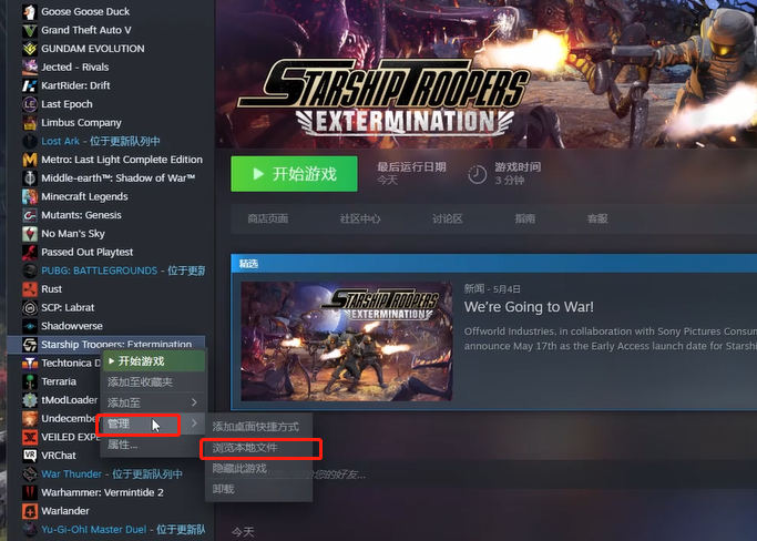 然后打开steam,右键点击星河战队灭绝游戏,点击管理-浏览本地文件