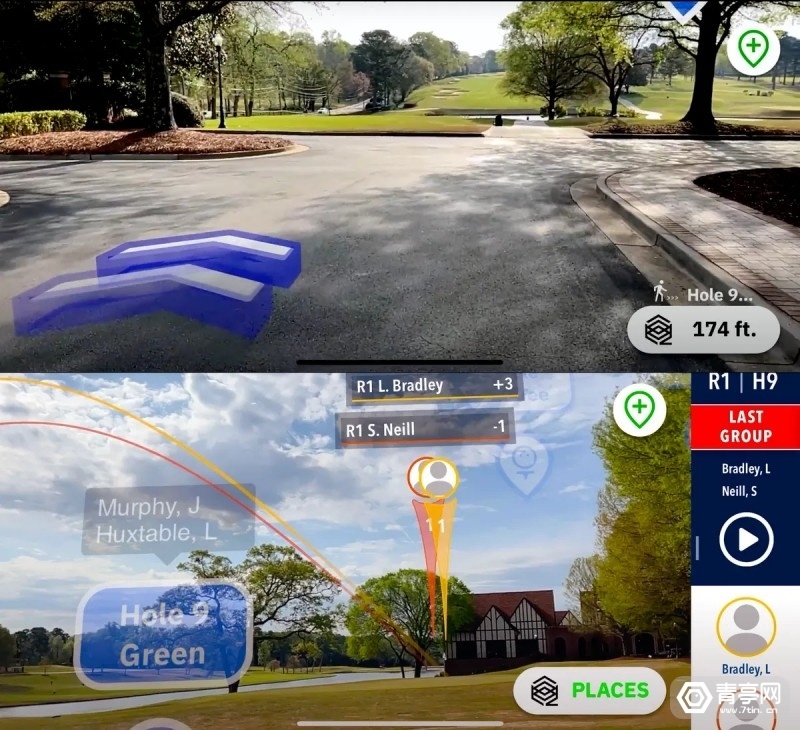 AR体育方案商Quintar也与谷歌就AR展开合作,将ARCore Geospatial API、StreetView与Quintar的Q.reality平台结合,打造交互式AR解决方案,并在PGA巡回赛的官方App中引入AR导航功能:Quintar Places,允许观众用摄像头对准现实场景查看视觉方向指示,并对比自己和目的地相差的距离,宣称精准度足够好(误差在几厘米以内)。