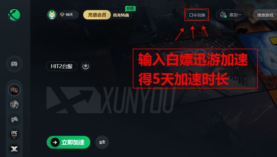 想要免费加速时长的玩家,输入【白嫖迅游加速】口令码,就能够兑换5天加速时长。