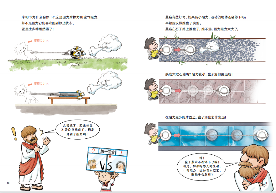 但是作者并没有直接告诉孩子。而是循循善诱,让亚里士多德和牛顿都参与了进来,在他们的讨论和“争吵”中,让孩子轻松的学到了惯性定律。