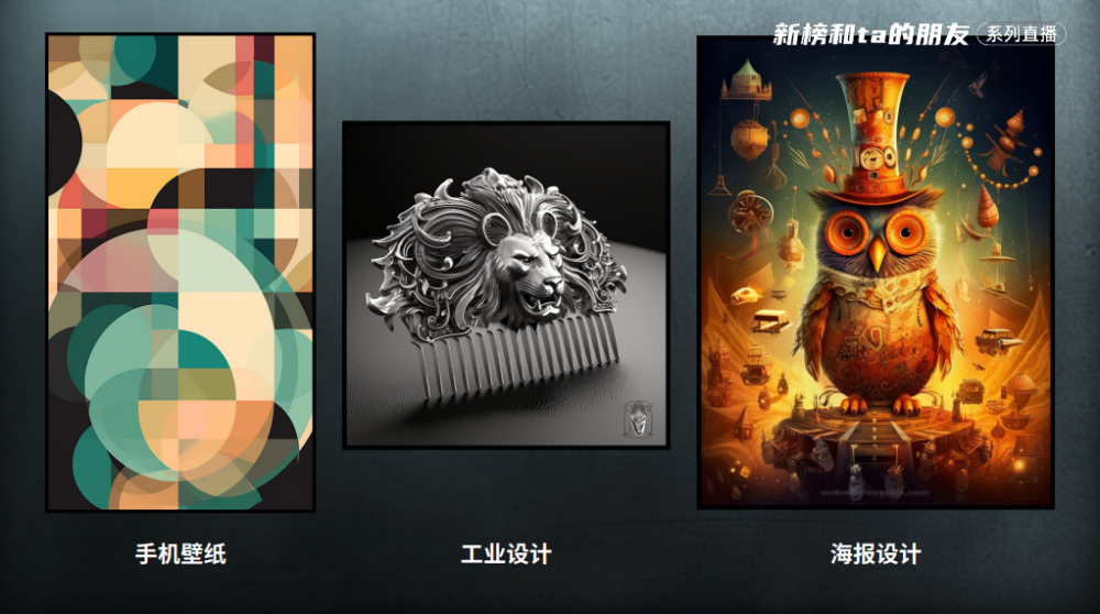 还有这几个不同的场景,比如我可以用AI做手机壁纸;做工业设计的基本原型、概念设计,拿它去做3D建模,甚至未来能够在工厂直接生产;海报设计它也能非常好地完成。
