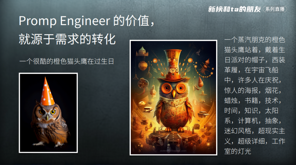 了解AI的朋友都知道有个概念叫prompt,指输入AI的关键词、描述词。目前AI还很难精确地去转化需求。比如我想画一个很酷的橙色猫头鹰过生日,这句描述AI不能完全理解,它画出了橙色猫头鹰,但很难抽象地理解“酷”,所以我要转化成很多描述词,告诉AI我到底想要什么元素。