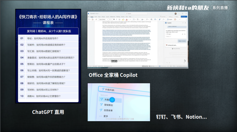 比如说在职场方面,我们可以直接使用ChatGPT去写各种文案材料,只用自然语言的交流就可以让AI帮你完成文字相关的很多工作。最近微软发布的office全家桶的Copilot,被称为助理或副驾驶,这些AI功能可以快速地帮我们完成一些辅助工作,同时,国内钉钉、飞书也都发布了自己的AI产品。