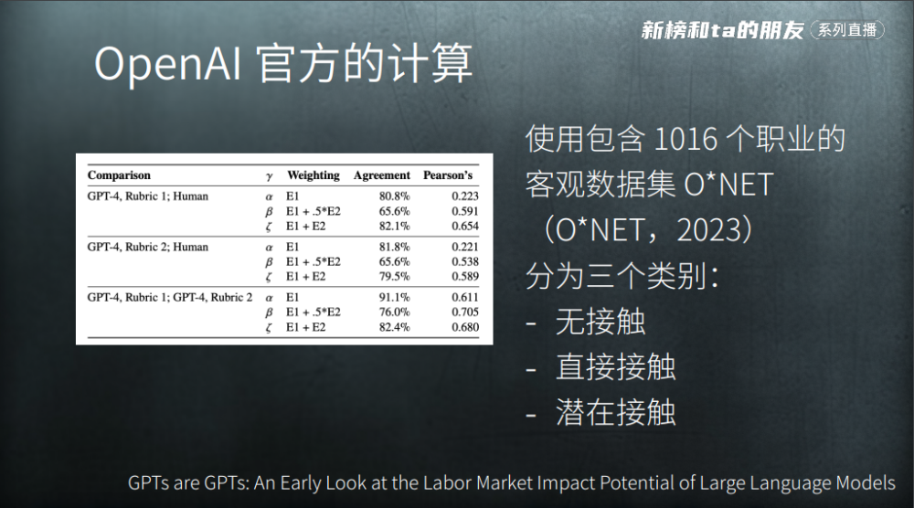 OpenAI官方对各种职业会不会受AI影响也有一个研究报告,这个测算可能有主观的成分,不是那么准确,但也尽可能做到了量化,大家感兴趣的话可以去了解一下。