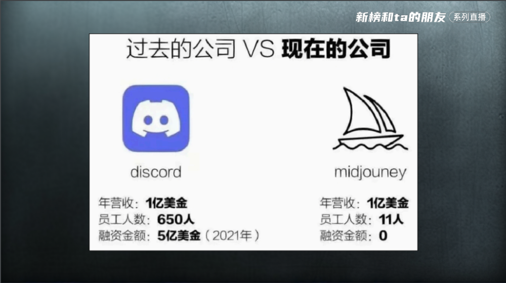 Midjourney成立至今,差不多一年左右时间,一直都是借用Discord的产品,目前有600多人在维护,融资5亿美金,现在年营收已经突破1亿美金了,但员工数我们从最新的官网看只有十几个人,就把这个公司搭起来了。