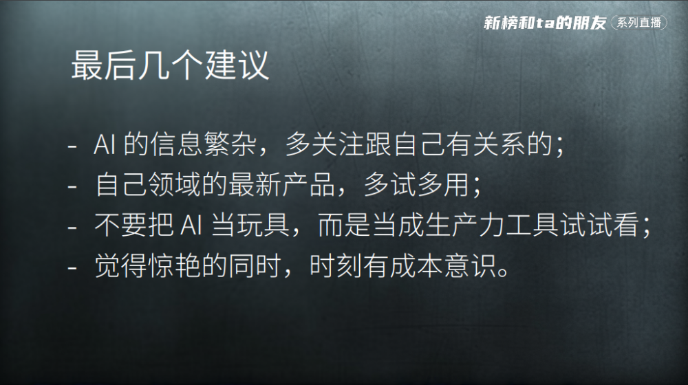以上就是我分享的主要内容,最后再给几个建议,多关注跟自己有关的AI信息,多尝试自己领域的新产品,把AI当作生产力工具来用,时刻要有成本意识。