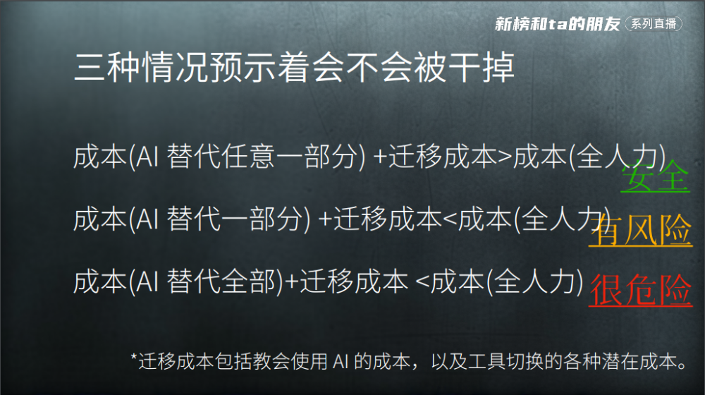 第一种情况是比较乐观的,使用AI替代工作的时候会发现这部分的成本是偏高的,再加上迁移成本之后,它会大于全是人工完成的成本,那就不会有老板去选择这么做。这部分从业者相对比较安全的。