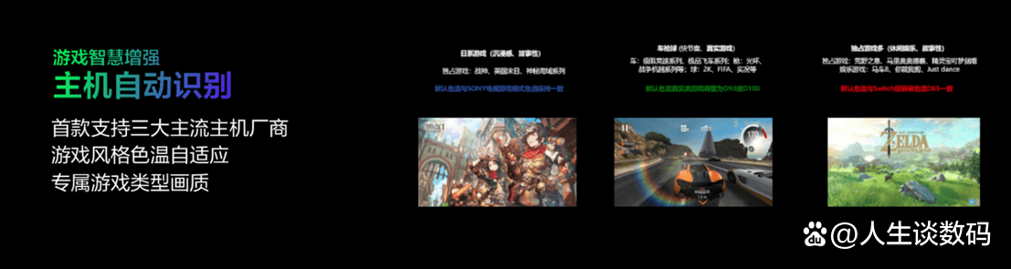 除了好基础硬件能保证游戏画质栩栩如生,华为 Vision 智慧屏Z 电竞版为游戏玩家进行专属的游戏画质智慧增强模式,让游戏画质更智能,打造自己专属的游戏画质。它是业界业界首个支持主流三大主机游戏厂商的智慧屏,能够自动识别游戏主机类型,并根据游戏类型,自动调整色温,让画质显示更符合游戏表达,自动开启低延时模式,让游戏不卡顿。