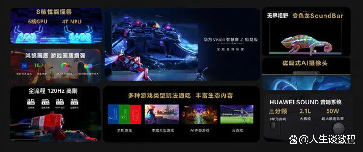 与传统游戏电视不同,华为 Vision 智慧屏 Z 电竞版不仅是一台具有高性能大屏,也是华为首款游戏电视,更是一台具有无限生态的入口。华为通过硬件软件生态全面布局,致力于将华为游戏智慧屏打造成为全能游戏的电视新标杆。