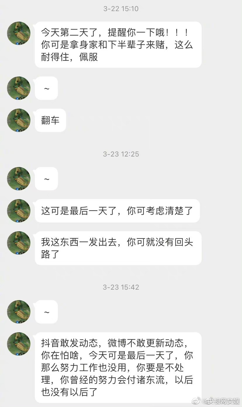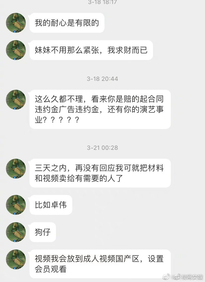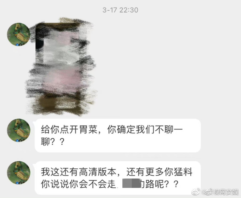 她晒出了对方勒索的部分截图,写道:“作为公众人物,我站出来或许可以让更多的人关注到这类恶性事件。被偷拍不是我们的错,我们的人生不应该因为这种事情而受到影响。希望大家都能安心地走在闹市区、僻静处,不用再因为一些心怀卑鄙龌龊想法的人而担惊受怕。”