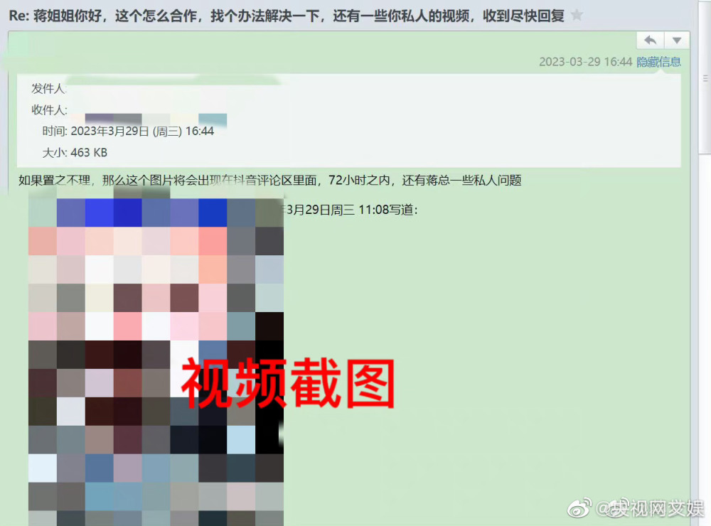截图显示有人声称有蒋女士的私人视频,并扬言如果对方置之不理,将公之于众。