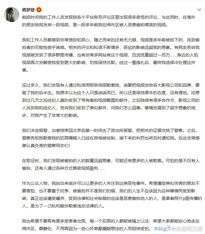 19日,@蒋梦婕 发文称多年前被恶意偷拍裙底,近日又因为该视频遭勒索,目前报警后嫌疑人已被控制。