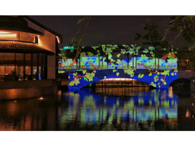 光影秀运用现代数字光影媒材将蟠龙千年记忆创新演绎,在小桥流水间呈现最美江南:粉墙黛瓦的“曲水萦居”勾勒水乡生活,以非遗编织技艺打造的江南游船带你走进“龙江古渡”,“香花桥影”和“程祠故里”重现文物建筑之美,“十字街市”上人影攒动,“古寺钟鸣”伴福意远扬……当夜幕降临,在亦古亦今的蟠龙天地,畅享缤纷光影的文化夜游,点燃城市的文化好奇心。