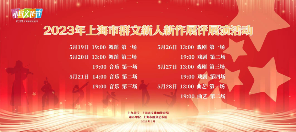 2023年上海市群文新人新作展评展演活动即将拉开序幕!想看看一年来上海群众文艺丰硕的创作成果嘛?想亲临现场欣赏艺术表演?想感受舞台氛围的美妙?11场新人新作展评展演活动正等你来!