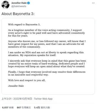 10月18日,黑尔发推回应争议。她说,作为配音业界长期活动的一员,她支持每位演员获得高薪的权利,多年来她一直在坚持这一点。不过她也希望人们秉持一种开放的态度。“我真诚地请求每个人铭记:这部游戏是由一批勤劳和敬业的人们所组成的一整个团队打造的。”