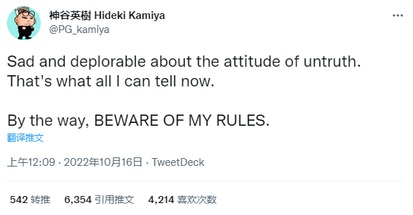 任天堂与白金工作室暂未对此事发表任何意见。只有神谷英树本人,在视频上传数小时后,用英语发了一条推特:“对不真实的态度感到可悲。这就是我现在能说的。顺便一提,注意我的规则。”
