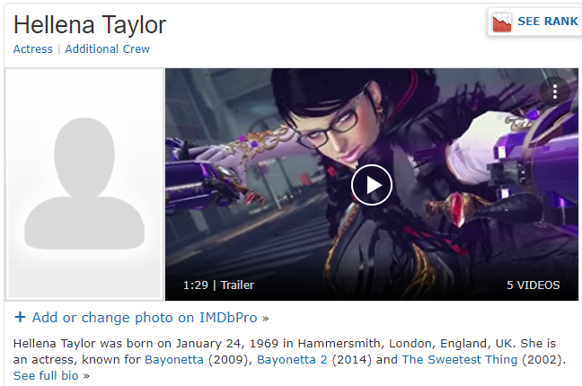赫伦娜·泰勒(Hellena Taylor)是一名英国配音演员,曾出演过24部影视及游戏作品。她和游戏业界的最大交集,是在《猎天使魔女》(又译《贝优妮塔》)的前两部作品中为女主角贝优妮塔提供英语配音。