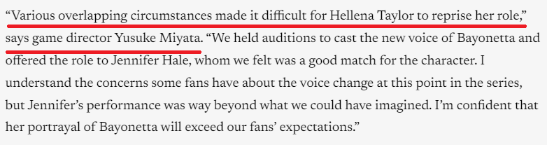 2022年10月5日,外媒Gameinformer采访了负责开发《猎天使魔女》的白金工作室。游戏总监宫田祐辅在采访中指出,詹妮弗的表现远远超出了他们的想象。“我相信她对贝优妮塔这个角色的演绎将超出粉丝的预期。”