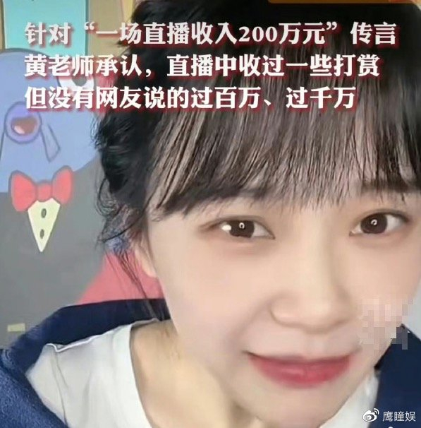 而在直播中,黄老师选择性回复网友提问时称,“感觉压力很大,怕说错话被人录屏。”而针对流传最广的“一场直播收入200万元”的传言,黄老师承认,直播中收过一些打赏,“但没有网友说的过百万、过千万,没有接任何广告,也没有与其他公司有商务合作。”同时,黄老师表示自己没有整容和p图。