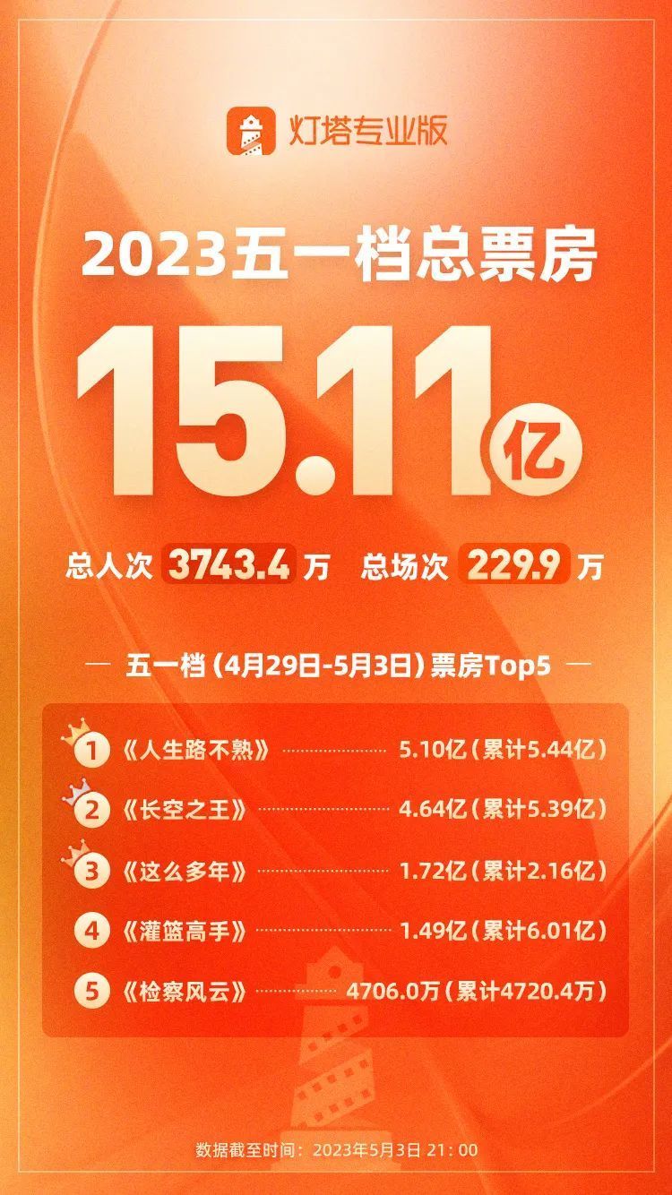 据灯塔专业版数据统计,2023年五一档(4月29日-5月3日)档期总票房突破15亿元,这是继2019年、2021年后中国影史票房第三高的五一档期。