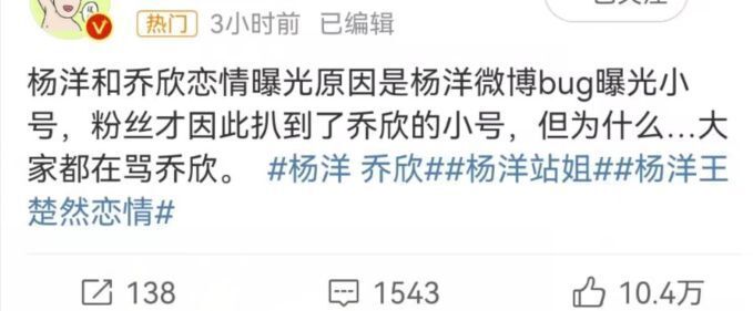 杨洋与乔欣的绯闻大家应该都听说过,两人的恋情之所以曝光,主要是因为杨洋微博bug曝光了自己的小号,粉丝顺藤摸瓜,找到了乔欣的小号。