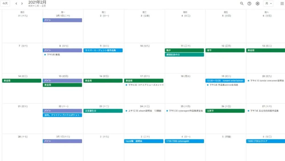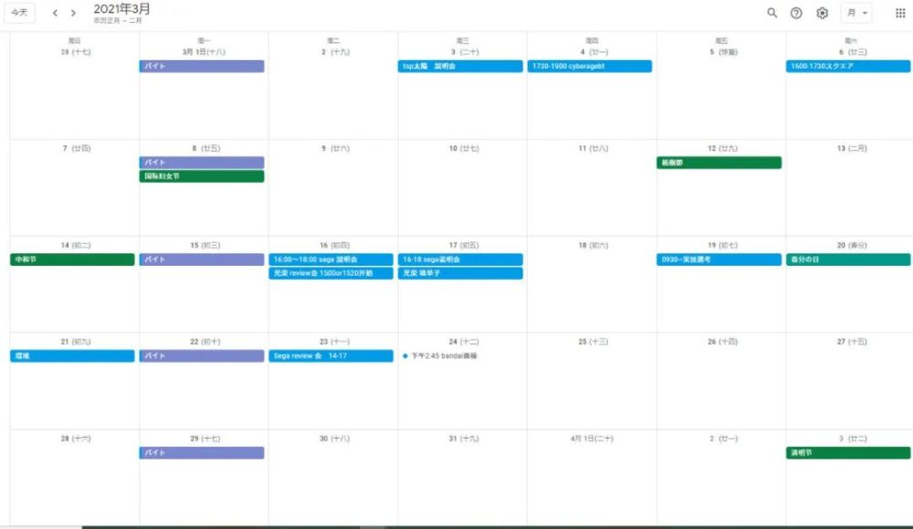 下图是我2、3、4月的日历。只看这个表还是比较宽松的。实际上,加上学校的事也没那么闲,感觉是以整个人的70%~80%负荷运转。