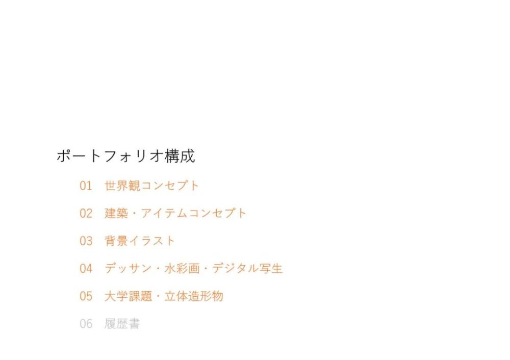 我的作品集一共有38页,如果双面打印就是二十张纸。其中【01】【02】【03】为原创作品,约25页。【04】【05】分别是素描等基本功和大学作业展示,约10页。履历书(非必要)和头尾页约5页。