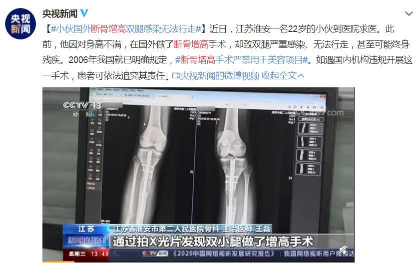 此外,还有人通过手术方式“断骨增高”,可能存在感染、致残的风险,现今已被国家明令禁止用作美容项目。