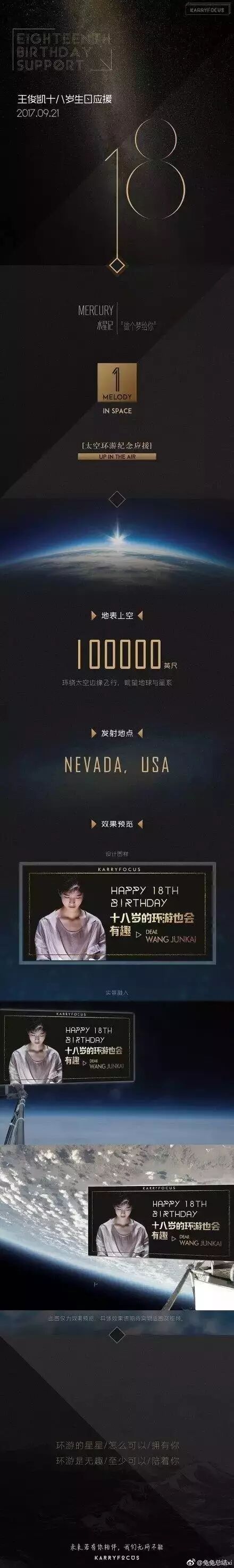 王俊凯曾说想知道宇宙的样子,于是粉丝们(KARRYFOCUS王俊凯基地站)就送他“太空环游纪念应援”,要将王俊凯的照片看板从美国内华达州发射上太空。