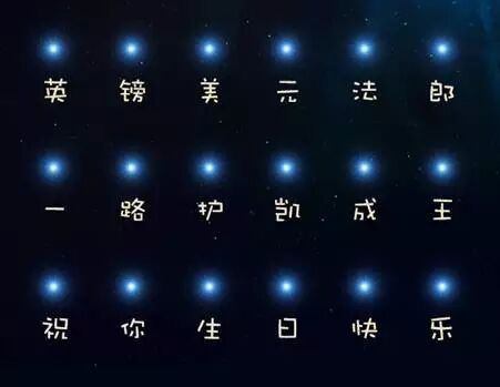 这18颗星星象征王俊凯的18岁青春,每颗星都代表一个字,连起来是:“英镑美元法郎,一路护凯成王,祝你生日快乐。”